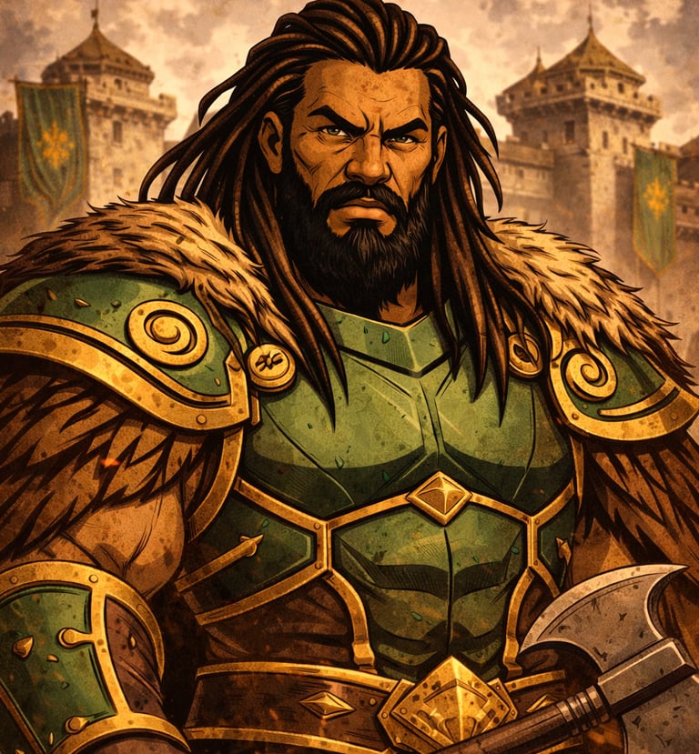 Broad-shouldered and powerfully built, Bakko wears his armour as a declaration. Every plate, every scar, every emblem is meant to be seen.