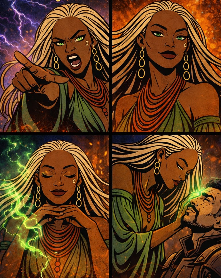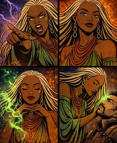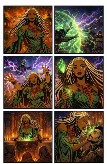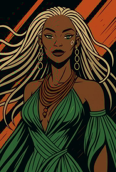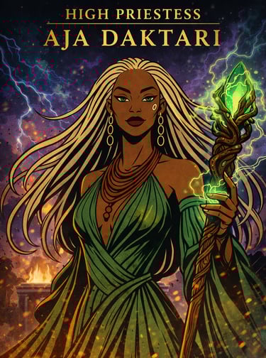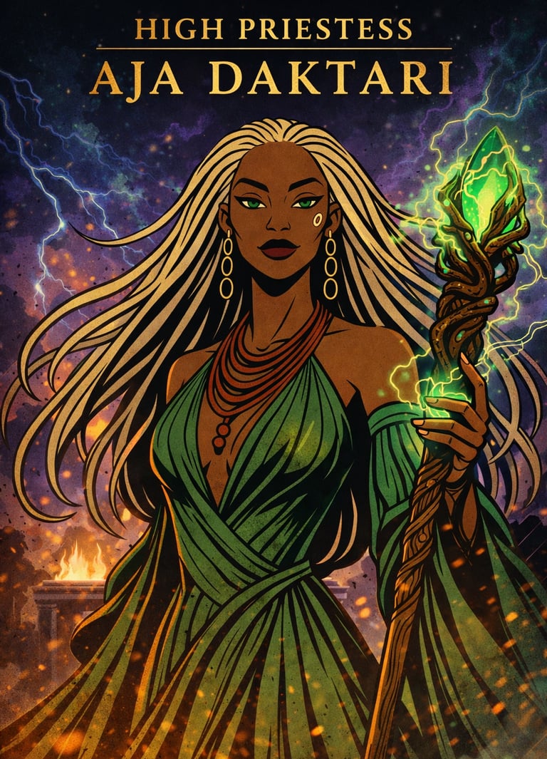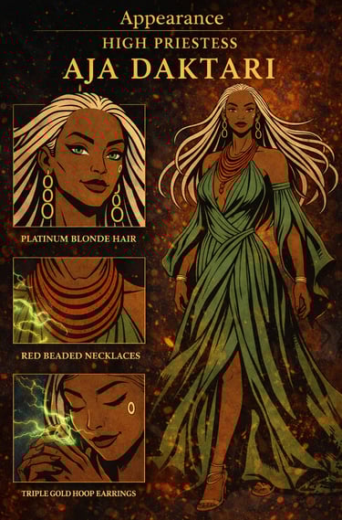 Chosen at seven lucas from the kinsmen of the Camu tribe by the Superior Guardians of the Fold of Aluke, Aja Daktari was shaped from childhood into vision and service. Gifted with sight beyond time, she was entrusted with guarding queens, guiding bloodlines, and protecting the future of Nu Oarren itself.