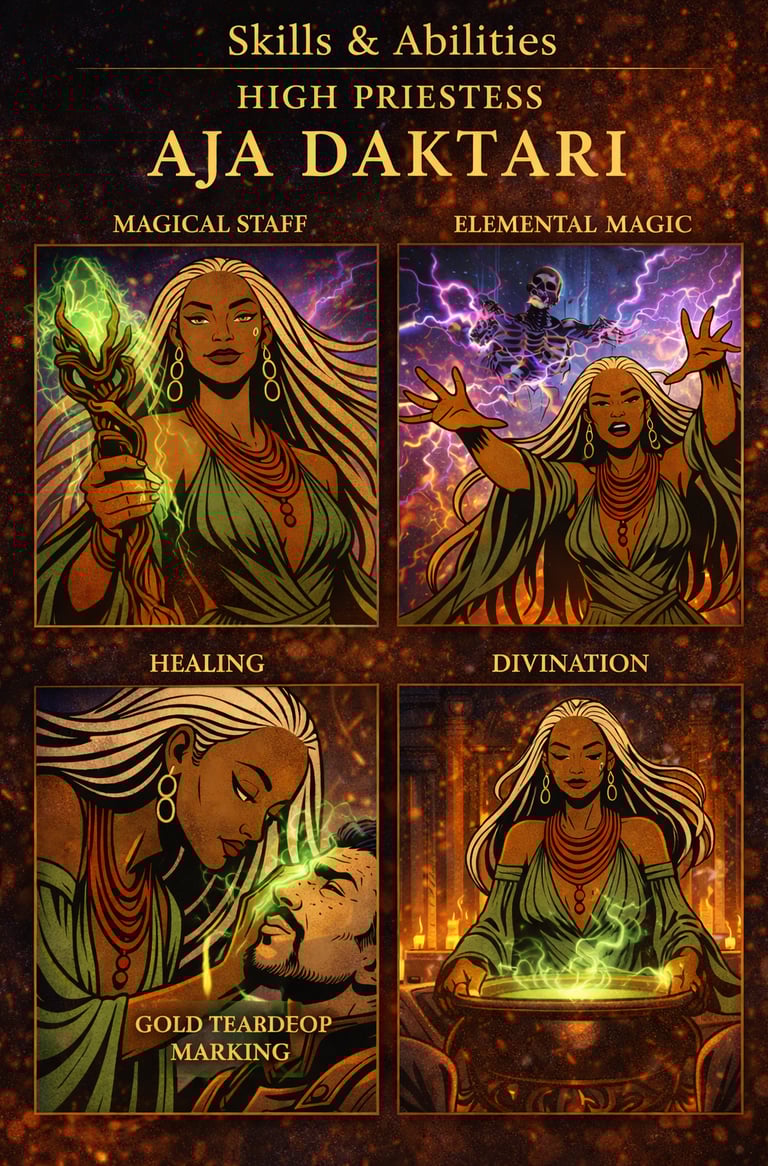 As Royal Seer to Empress Subira, Aja stood at the highest spiritual rank within the kingdom. Her marriage to Duke, the Imperial Officer, bound her to both prophecy and power, a union celebrated publicly and questioned privately.