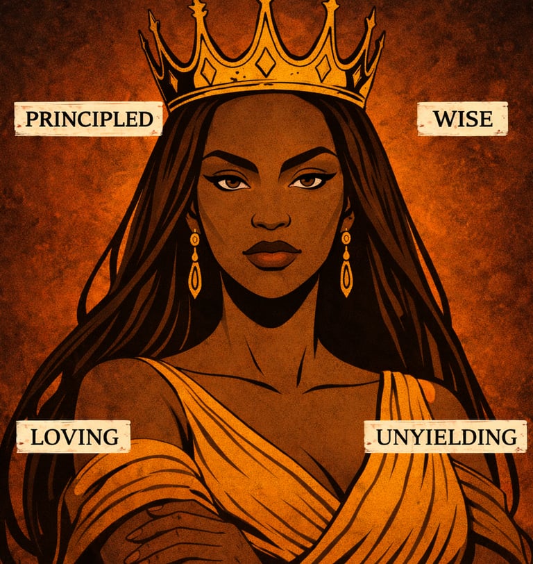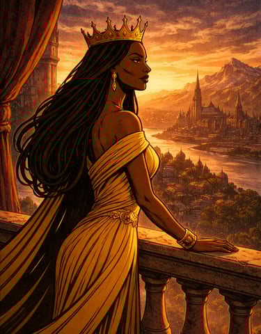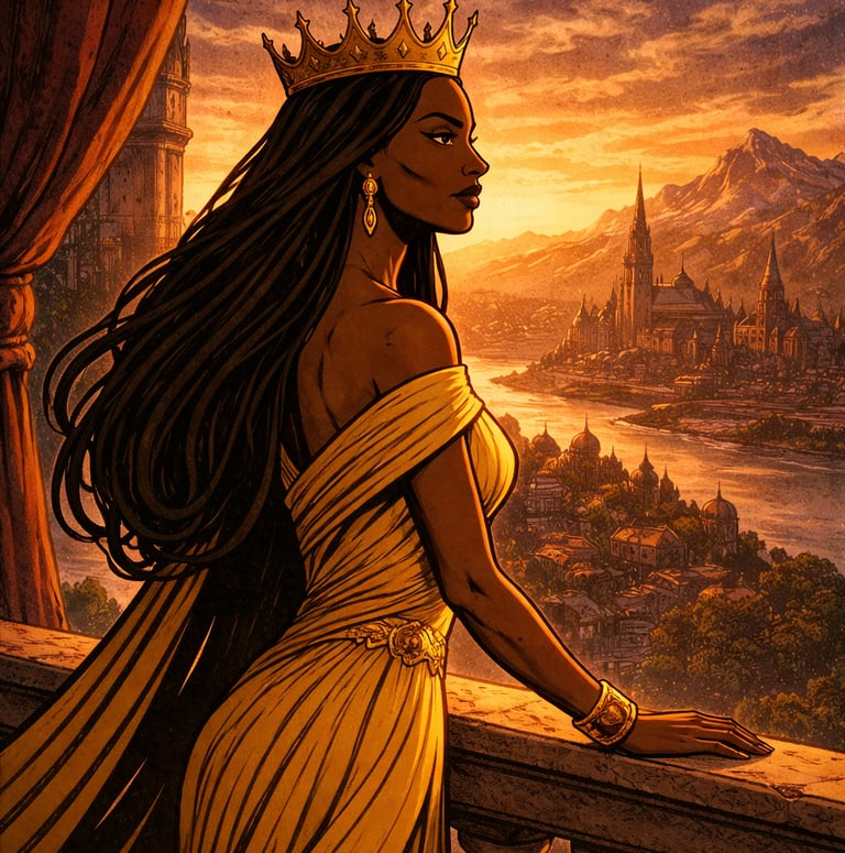 Adorned in finely crafted garments that reflect both royalty and practicality, she wears elegance with intention. Every movement is deliberate, every glance considered; nothing wasted, nothing accidental.
