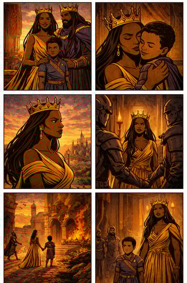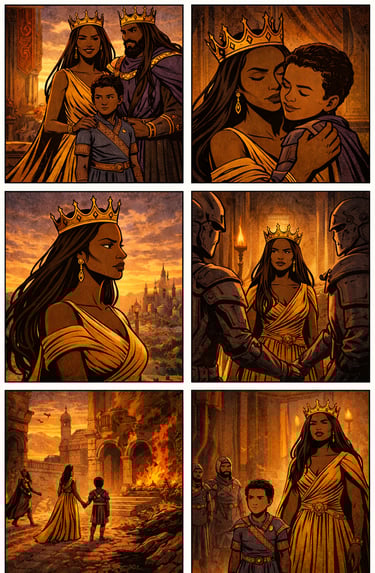 She stands beside King Javari not as ornament, but as equal—his conscience when he doubts, his anchor when prophecy presses too hard. Yet her fiercest allegiance lies with her children, especially the son taken from her and the daughter whose destiny threatens to eclipse her freedom.