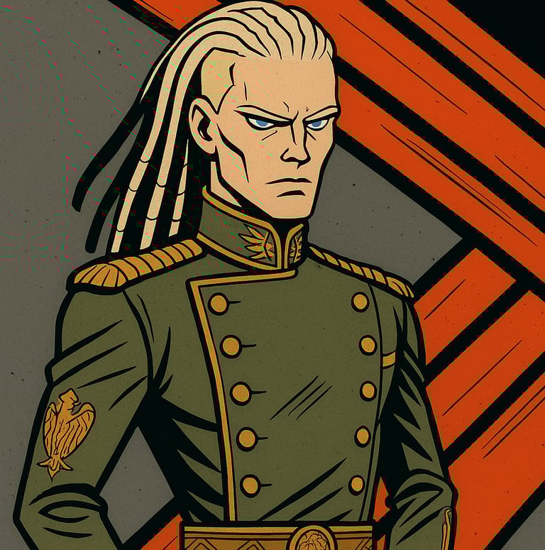 With striking albino features and shoulder-length pale dreadlocks, Sonkkel stands apart without trying. His tailored military attire reflects precision rather than bravado; every detail chosen, nothing wasted.